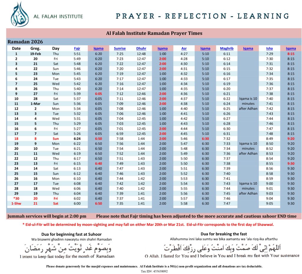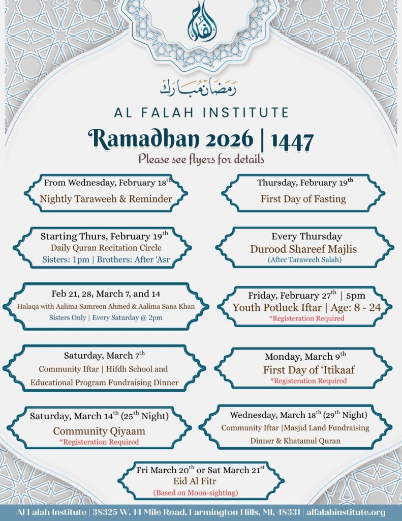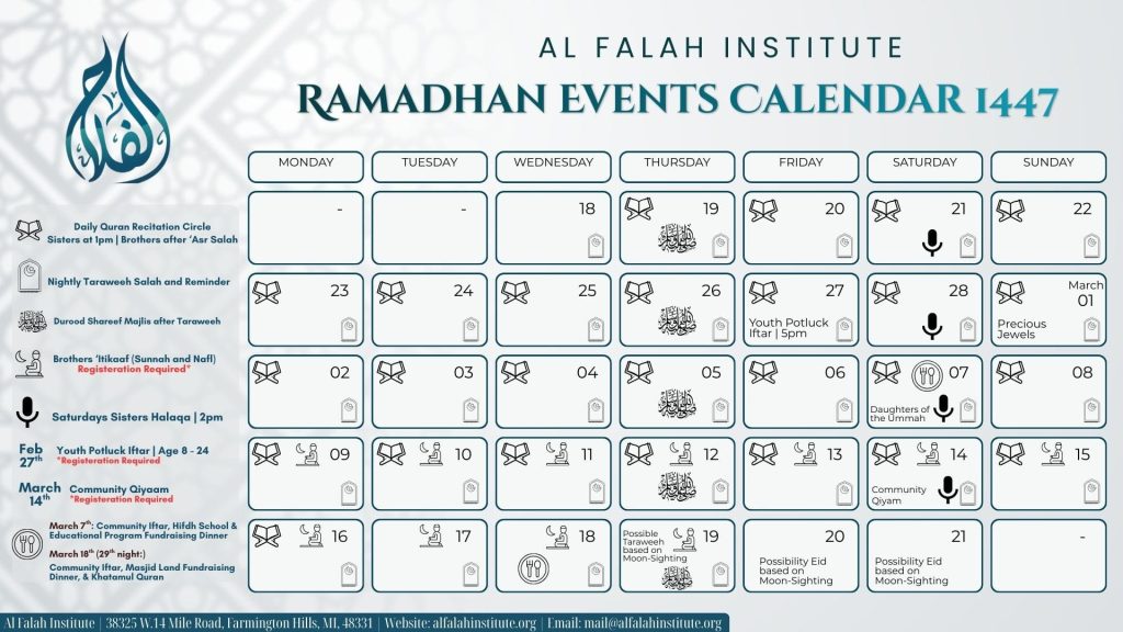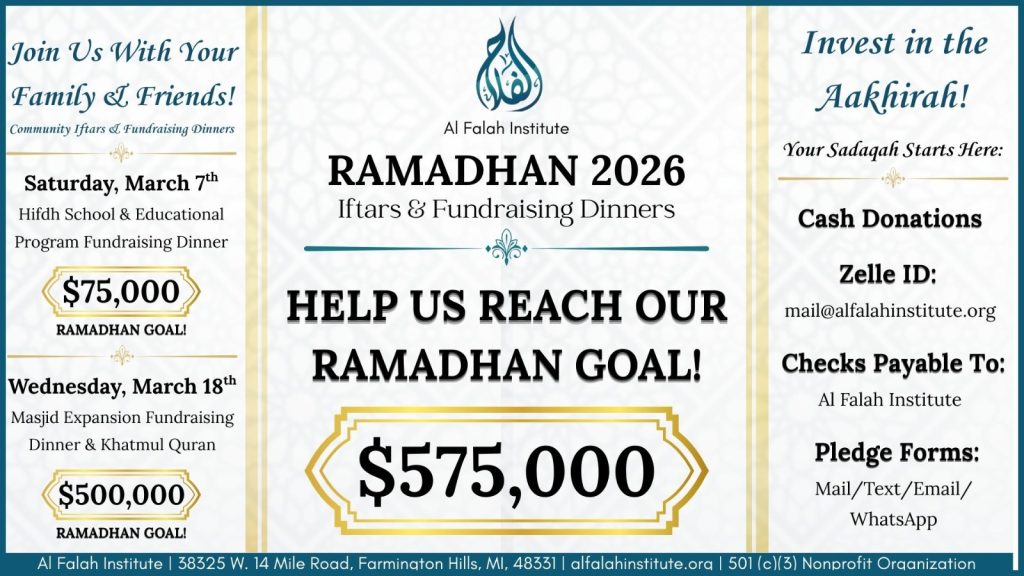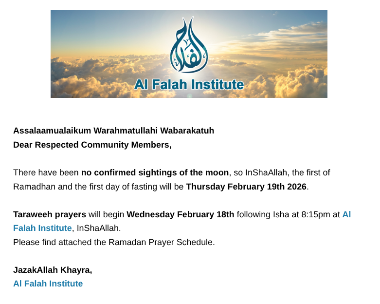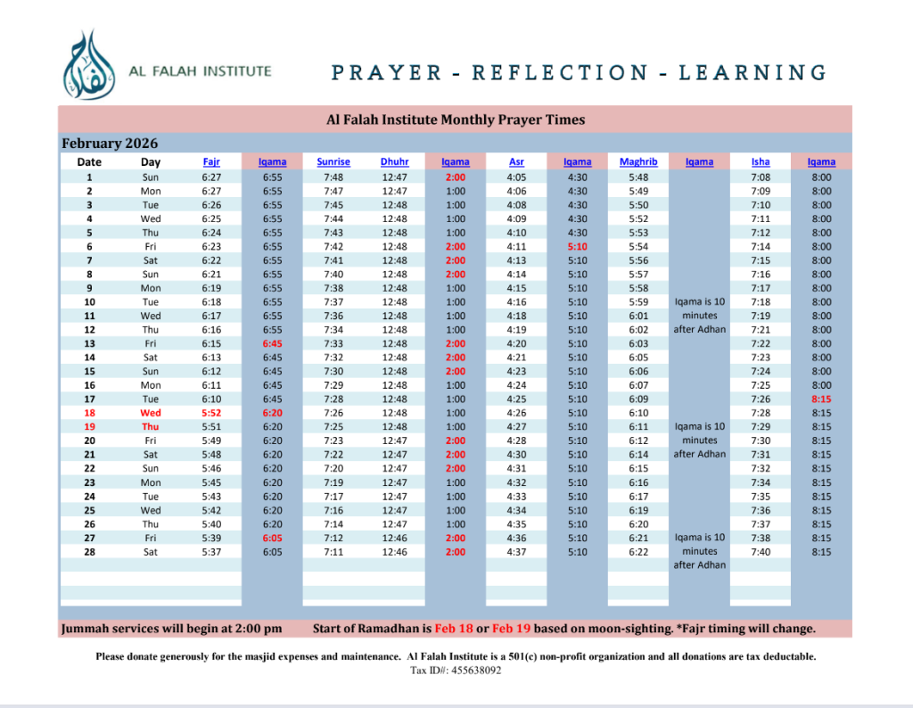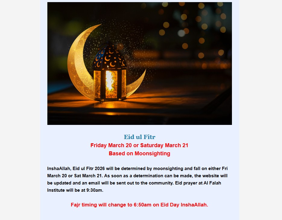 The aim of Al Falah Institute and Masjid is to provide a place of prayer and learning for the growing local Muslim community and to be a center for contemplation, preservation and implementation of traditional, sound islamic knowledge.