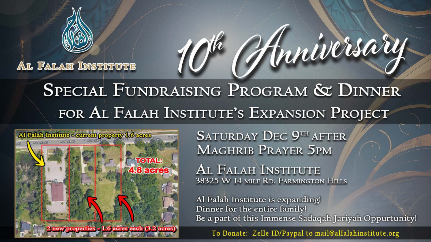 Special Fundraising Program & Dinner for Al Falah Institute's Expansion Project Event Content Saturday Dec 9th 2023 after Maghrib Prayer 5:00pm. Dinner for the entire family. Be a part of this immens...
